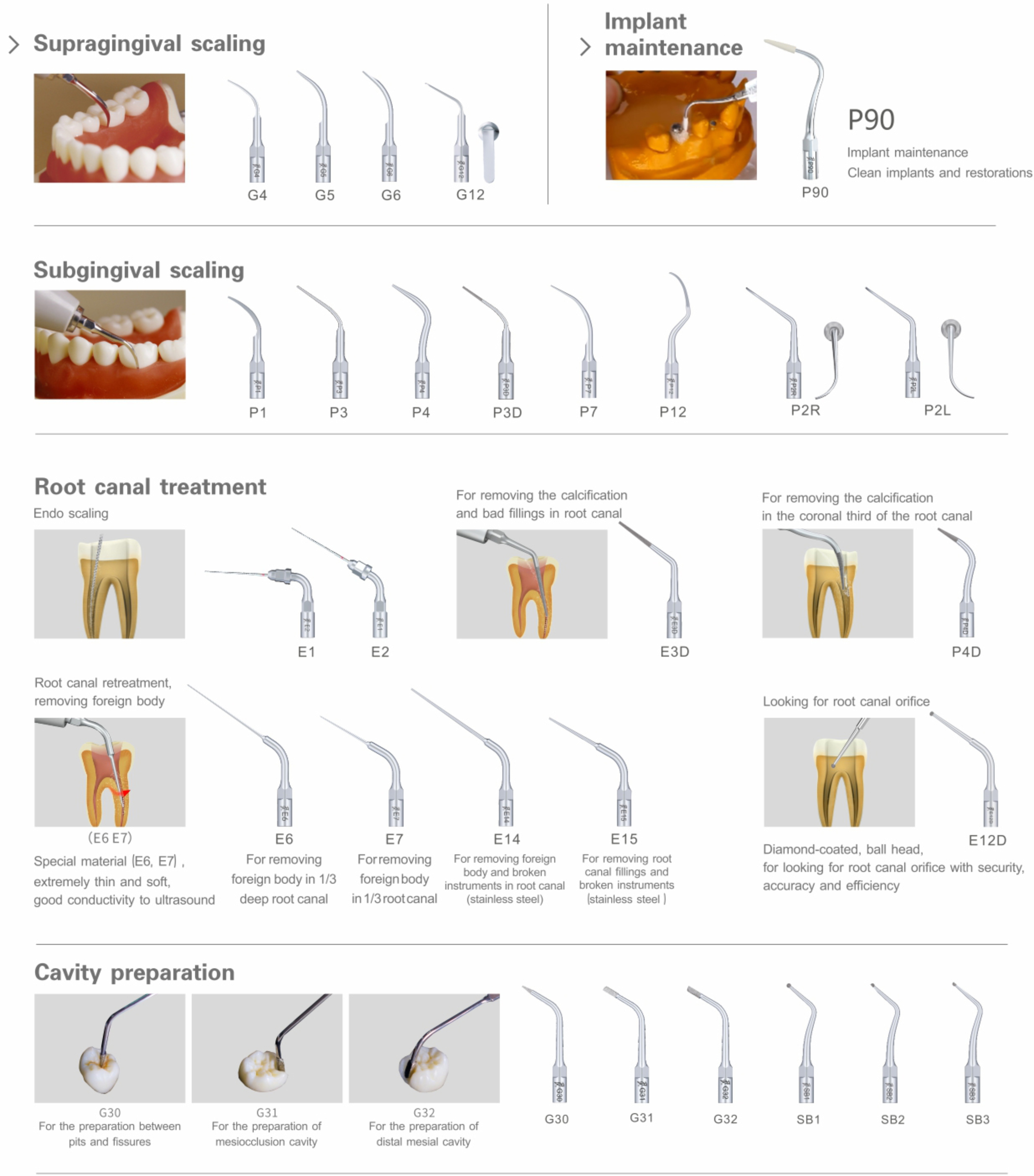 • It can be applied to a variety of clinical purposes including general tooth cleaning, root canal irrigation, and a series of products for the current treatment of periodontal disease, which can treat periodontal disease, root canal irrigation, and implant cleaning, with a wide range of applications and multiple functions It can be used for supragingival scaling, subgingival scaling, minimally invasive restoration, implant maintenance, and root canal treatment in one Scaler.