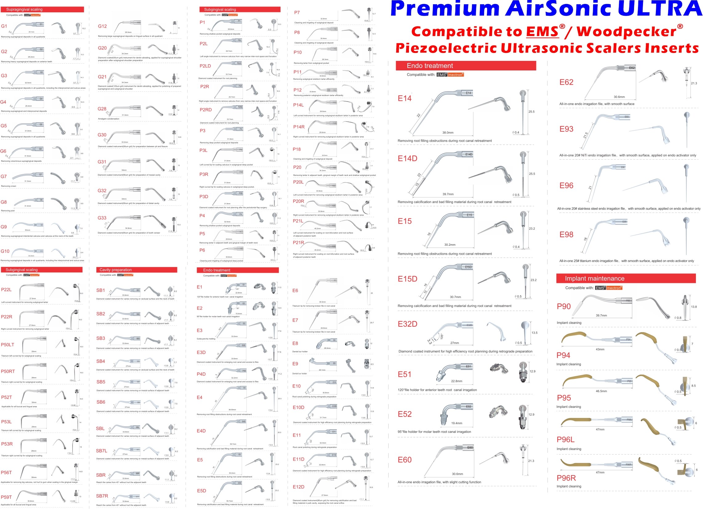 • The Premium AirSonic ULTRA is the instrument of choice for a variety of treatments, including prophylaxis, Endodontics, EndoClean, perp or fissure sealing, Periodontology, Dissection, minimally invasive caries therapy, and Surgery.